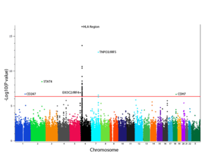 En este sentido, nuestro grupo de investigación lleva décadas tratando de dilucidar las variantes genéticas involucradas en el desarrollo de diversas enfermedades autoinmunes sistémicas, tales como la esclerodermia, la arteritis de células gigantes y la artritis reumatoide, entre otras. Durante los últimos años hemos conseguido contribuir de forma considerable al conocimiento actual de la etiología de dichas patologías. De forma notable nuestro grupo lideró el primer estudio de asociación de genoma completo (GWAS) en esclerodermia (Radstake et al. Nat Genet. 2010), dónde identificamos que los genes HLA, IRF5, STAT4 y CD217 como los principales responsables del desarrollo de la esclerodermia. Este estudio genes el cual fue la base para una serie de estudios posteriores que nos situaron como referentes a nivel internacional en la investigación de las bases genéticas de esta enfermedad. Entre ellos cabe destacar el primer Immunochip (una plataforma mediante la cual se pueden analizar 200.000 variantes de genes involucrados en la respuesta inmunológica y asociados a diversas enfermedades autoinmunes) realizado en esta enfermedad y que permitió la identificación de nuevos genes de susceptibilidad a esclerodermia como ATG5 (un gen implicado en autofagia), DNASE1L3 (que codifica una proteína secretada por macrófagos y encargada de la fragmentación del ADN durante procesos apoptóticos) y el gen de la interleukina IL-12 (Mayes et al. Am J Hum Genet. 2014). Estos hallazgos nos han permitido conocer que el sistema inmunológico innato y adquirido es una de las vías principales alteradas en la escleroderma o esclerosis sistémica. (Bossini-Castillo et al, J Autoimmun, 2015).
