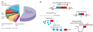 Un L1 funcional consiste en una secuencia de ~6kb que codifica actividades esenciales para su movilización, incluyendo AP endonucleasa (EN) y reverso transcriptasa (RT). El mecanismo de movilización alterna soportes de DNA y RNA, y está probablemente entroncado en los orígenes evolutivos del actual flujo de información entre ácidos nucleicos (Richardson et al. Mob DNA III 2015). La actividad promotora Pol_II de la 5?UTR es responsable de la transcripción sense de un RNA poliadenilado de L1, que es traducido en el citoplasma y se une en cis a su propia maquinaria. Ambos retornan al núcleo para catalizar la síntesis de una copia nueva por target-primed reverse transcription (TPRT), que implica un corte en una hebra del sitio de inserción del genoma y el uso del extremo 3? hidroxilo como primer para la reversotranscripción del RNA de L1 a la primera hebra del cDNA (Luan et al. Cell 1993; Cost et al. EMBO J 2002). Se desconoce como L1 restaura la integridad de la hebra del genoma y sintetiza la hebra de cDNA complementaria, pero posiblemente implica la coordinación de parte de la maquinaria celular. Por el contrario, Alu y SVA son elementos compuestos, más modernos, pequeños y no codificantes que se movilizan utilizando la maquinaria de L1 en trans (Dewannieux et al. Nat Genet 2003; Hancks et al. Hum Mol Genet 2011).